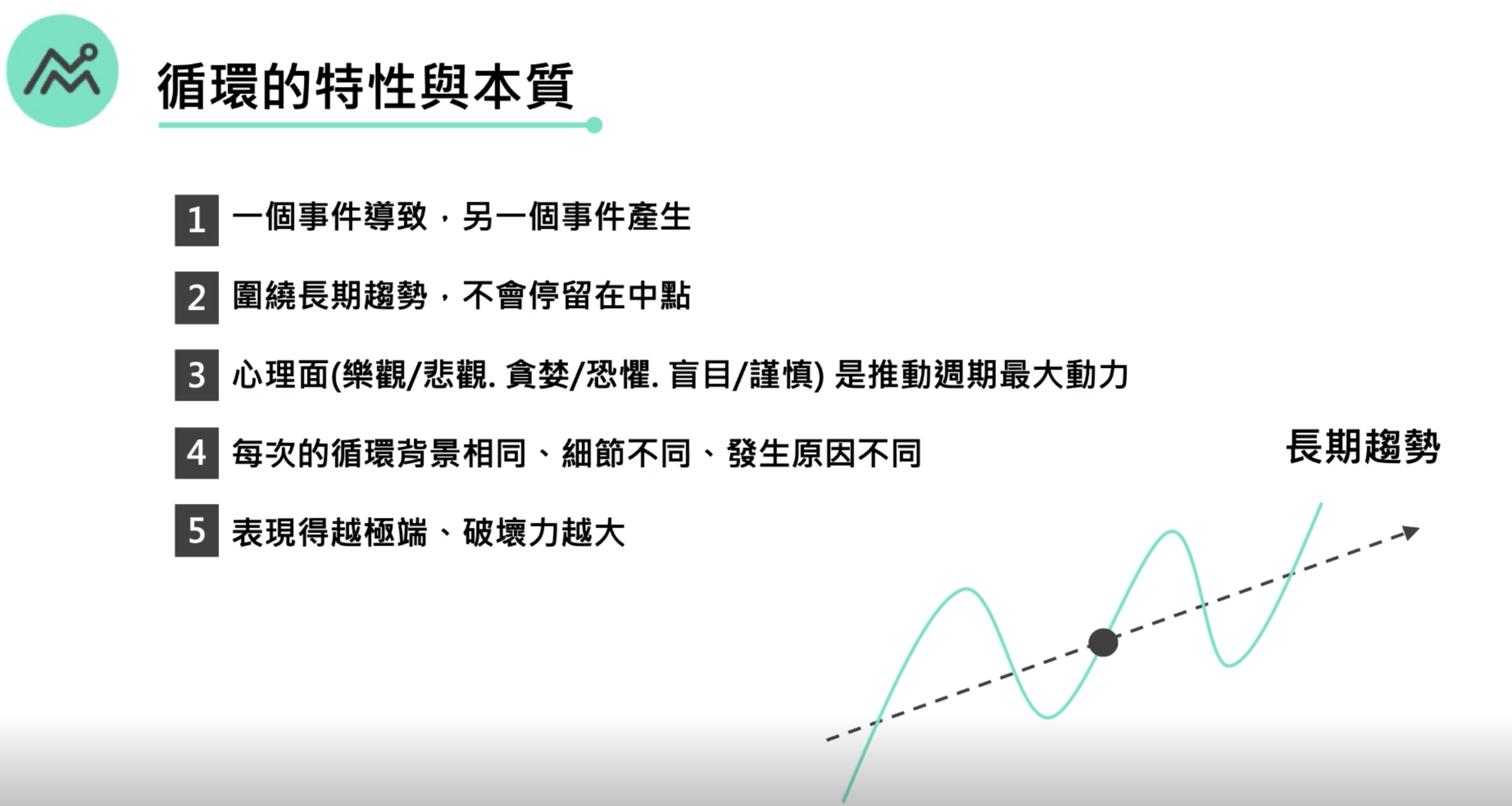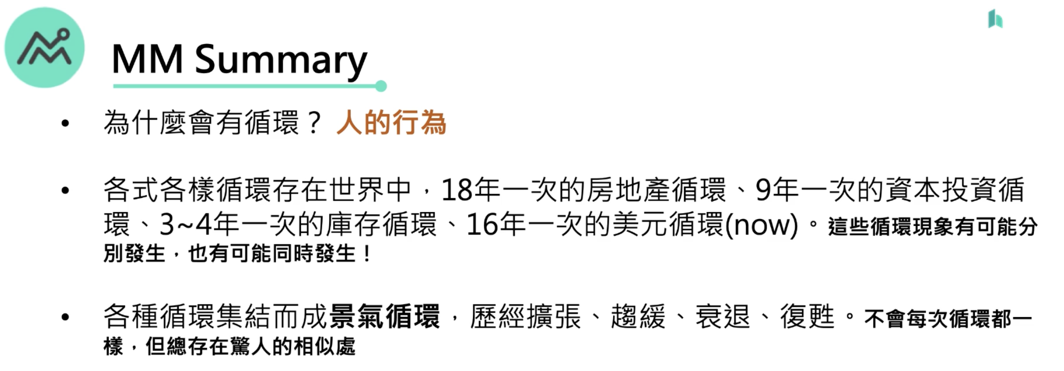 一個事件導致另一個事件產生,例如網路泡沫後,低利率造成房地產的榮景,卻又因為升息導致房地產的泡沫,而再次出現降息。關鍵就是心理層面是推動週期的最大因素,往上總是覺得還會再更好。歷史不會每次重演,但總會有相似之處。