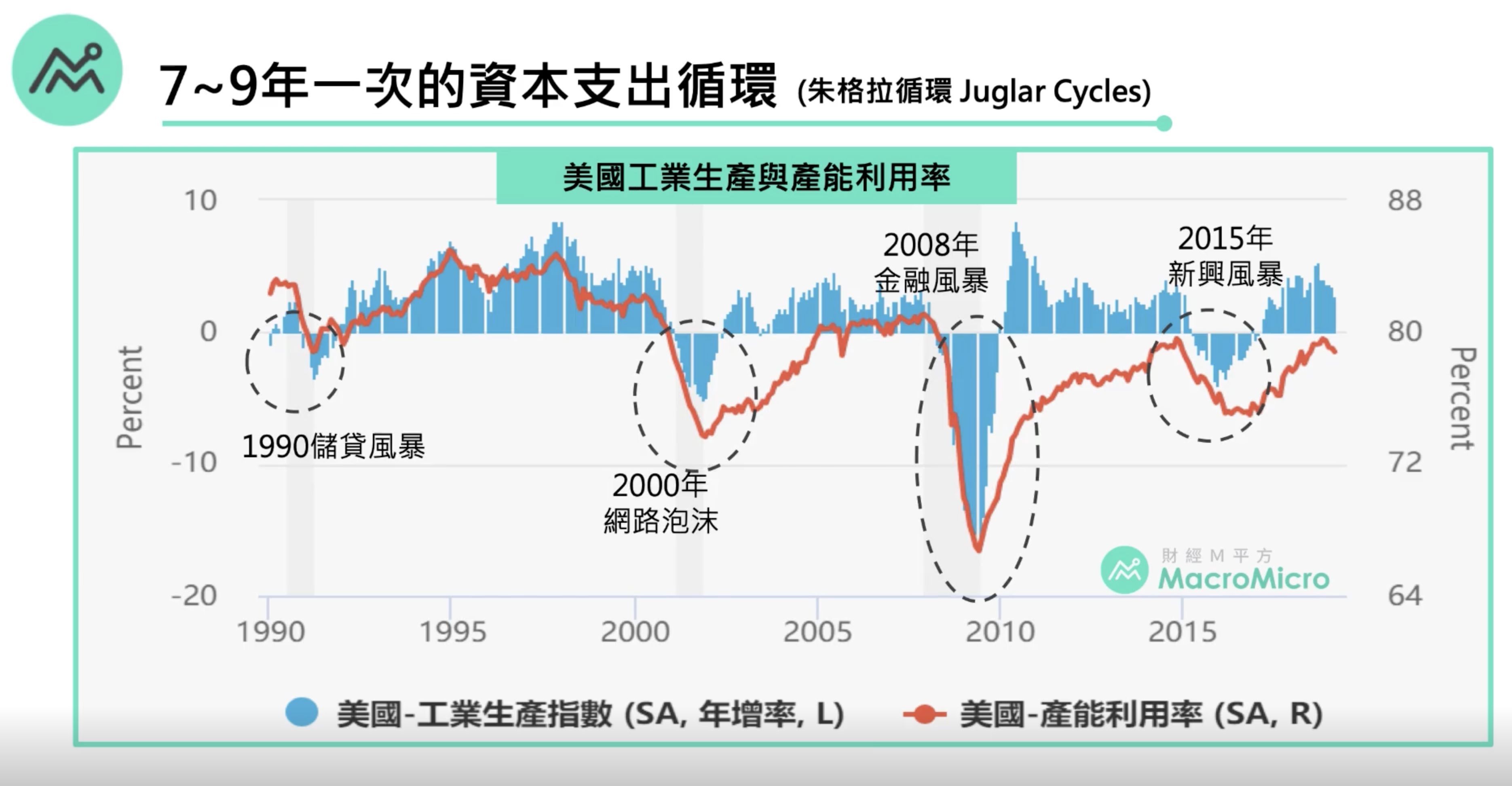 第二種循環為7~9年一次的資本循環。關鍵的原因都在資本支出大約佔GDP 15%,循環衰退的時候,資本支出只要減少1/3,就大約減少GDP四個百分點