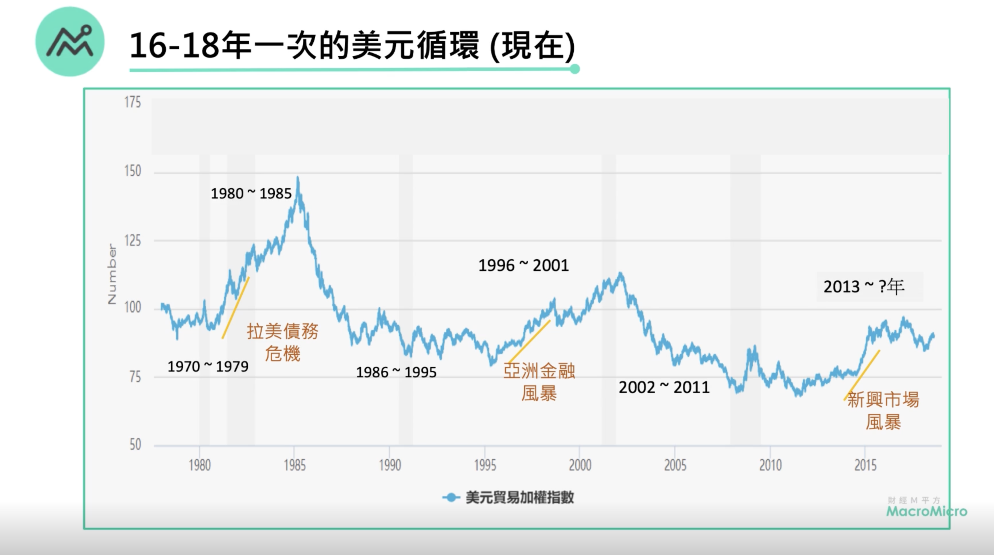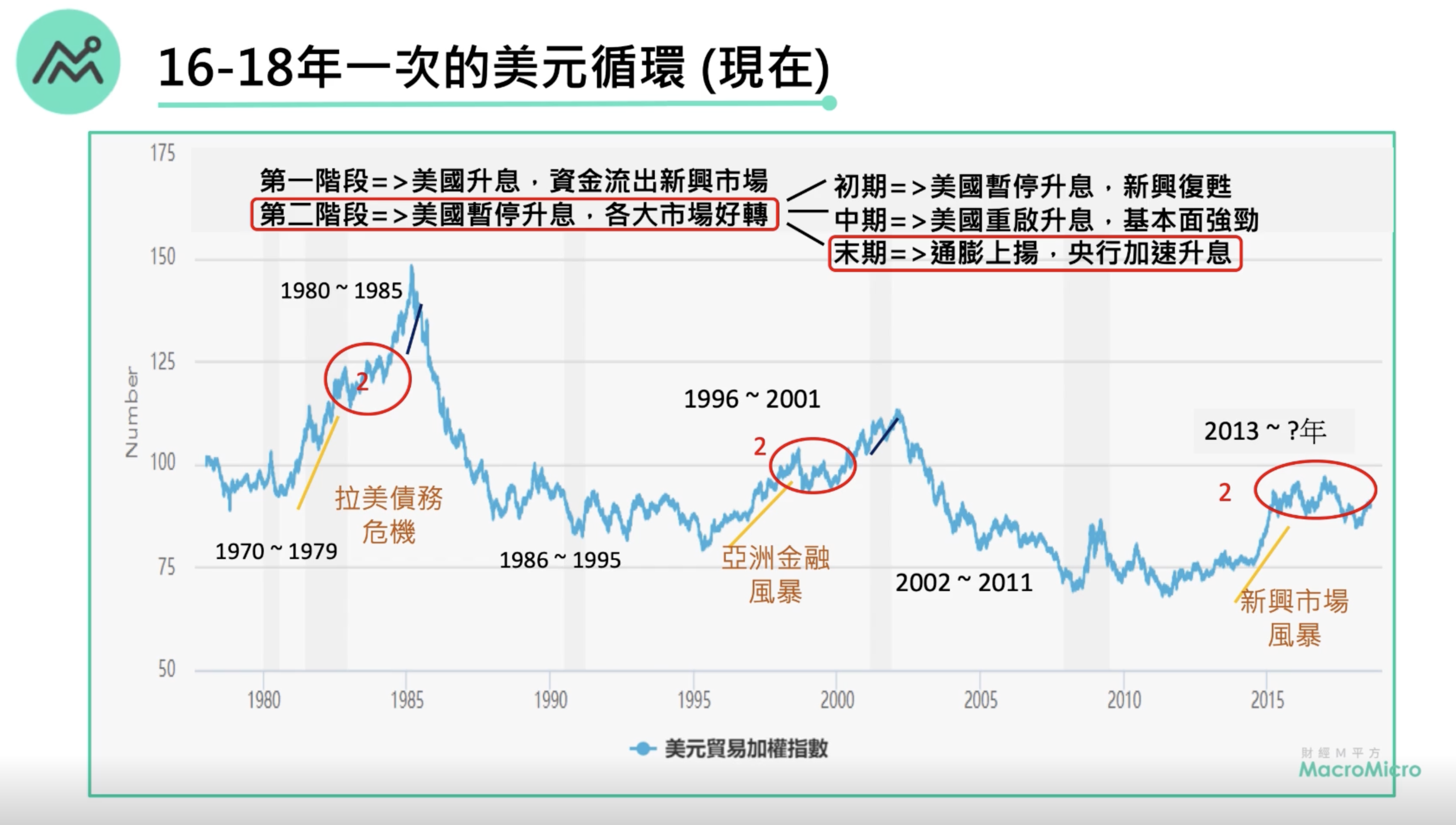 美元70年代將製造的機會傳送到拉美國家,衍生出的即為墨西哥債務危機。接著為亞洲的崛起,一樣大幅設廠、擴充產能,但當美國再次升息,即造成亞洲金融風暴。再來金磚四國在2000年後起飛,而當2015年後美國又再次升息,引發的即為新興市場風暴。