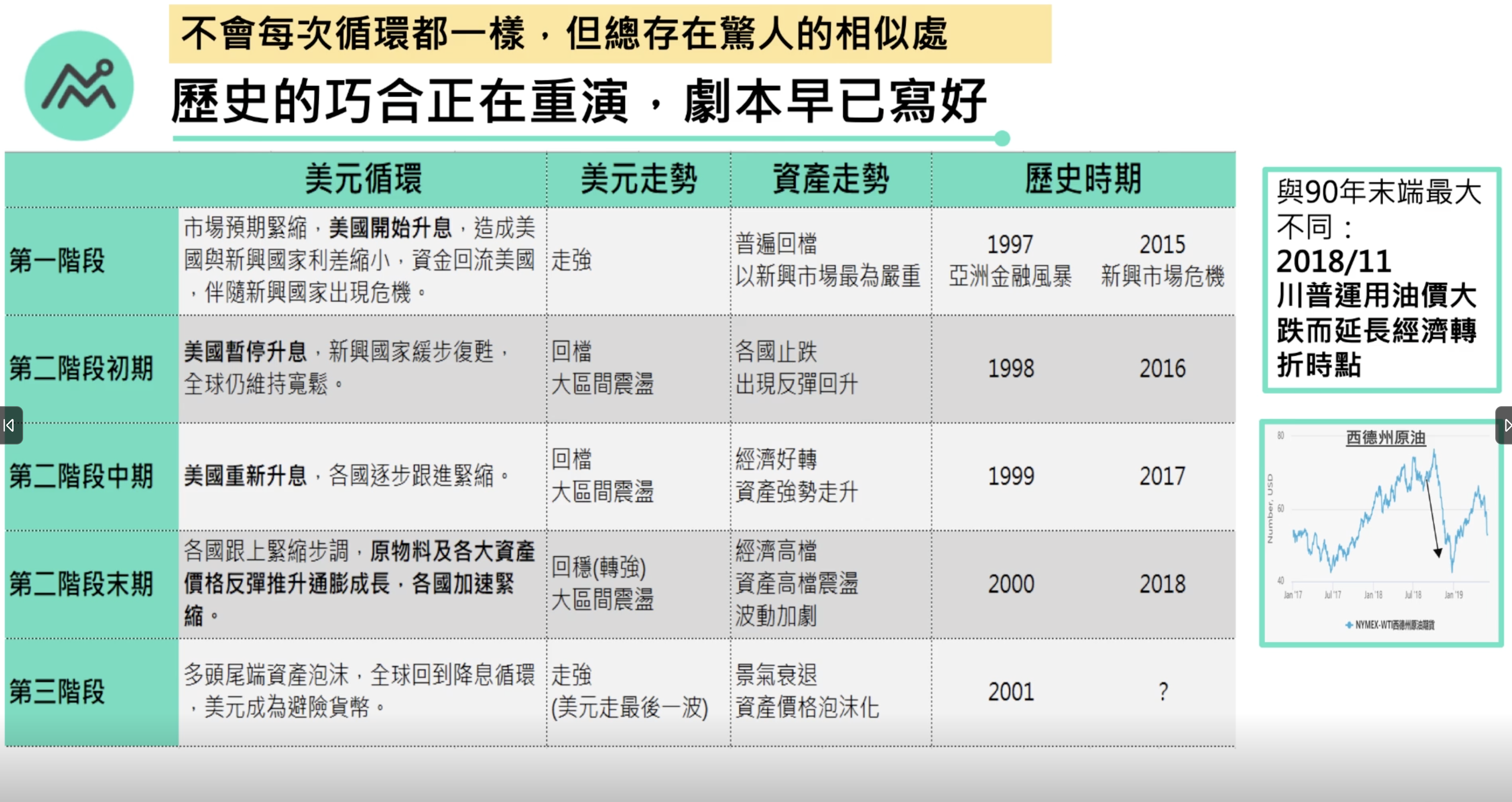 2.2016年,美暫停升息,給了新興市場一個復甦的空間,進入盤整期。如1999年末一直升到網路泡沫時期,美元成為避險貨幣